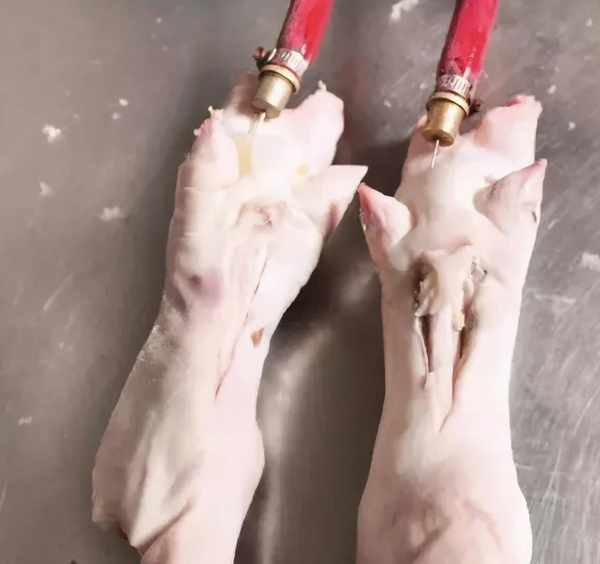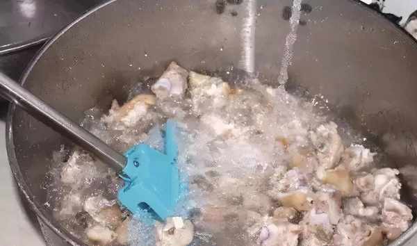 4、用拖把桿頂端的三個平行滾軸將豬蹄反復搗洗幹凈。
