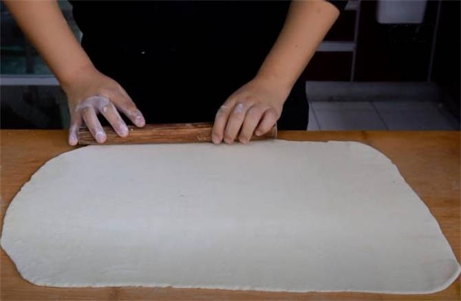 3.開始處理面團,案板上撒點幹面粉,稍微的揉兩下按扁,搟成長方形的面皮。