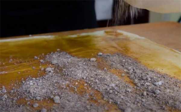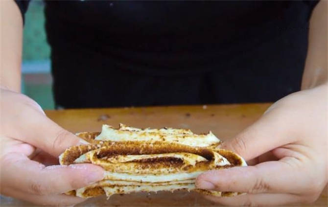 4.搟好之後,表面先刷一層油,再倒上芝麻醬,把糖抹勻瞭之後,然後疊起來。