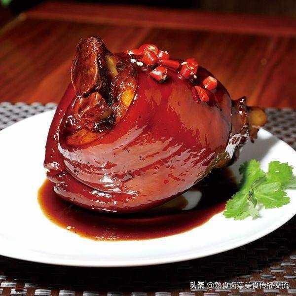 3.醬汁制作:在鍋中加入25磅骨頭湯和香料。首先,將處理好的豬肘或豬蹄放入鍋中,加入精鹽300克、生抽500克、熟花生油250克、味精50克、蔥根一根、生薑150克。開始用大火煮10分鐘。煮沸後,加入適量的紅曲,50克料酒,然後燉1小時。出鍋前半小時加入150克冰糖,去掉多餘的高湯(下次使用)、蔥根、生薑和香料,加入5克味精,從湯中取出。