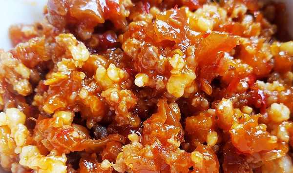 (二)制作方法:1.將子雞肉用刀剔去白筋,剁成細末;再把開遠藠頭,用刀剁成細米顆待用。2.將剁細的雞肉末放入碗內,加入水淀粉、味精、精鹽拌勻,用手捏一下。把炒鍋放在火上燒紅,放入豬油,待豬油熬熱,隨即把雞肉末倒入,用炒勺攪散,即連續把剁碎的藠頭倒入鍋中,連同雞肉末在鍋內翻一道身,迅速加上甜醬油、白糖,將鍋抬起,再順抖三下,盛入盤中,灑上麻油即成。