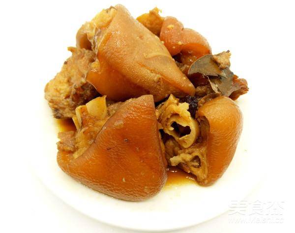 豬蹄500克、精鹽5克、生抽20克、胡椒粉5克、幹辣椒15克、八角10克、香葉5克、白蒜15克