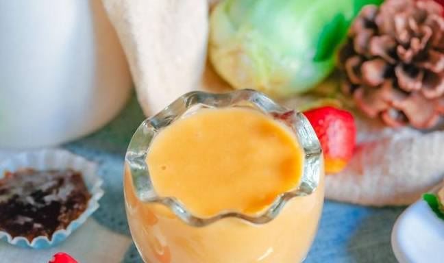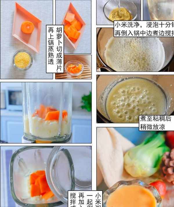3.小米粥放涼後,倒入攪拌機,再倒入胡蘿卜,再倒入少量溫水,攪拌成細膩的迷糊即可