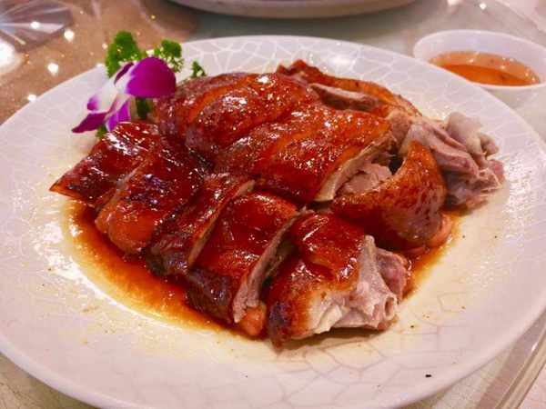 這道源自江門新會古井鎮的經典美食主要以黑褐色鵝為原料。剛烤好的鵝是深紅色的,有光澤,非常誘人!