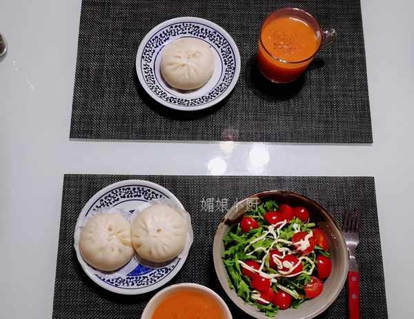 晚餐:胡蘿卜濃湯+圓白菜肉餡包+沙拉晚餐吃得挺可憐,我一杯胡蘿卜濃湯,一個包子,給先生加瞭個簡單沙拉。剛出鍋包子喧騰柔軟,咬起來不費勁。