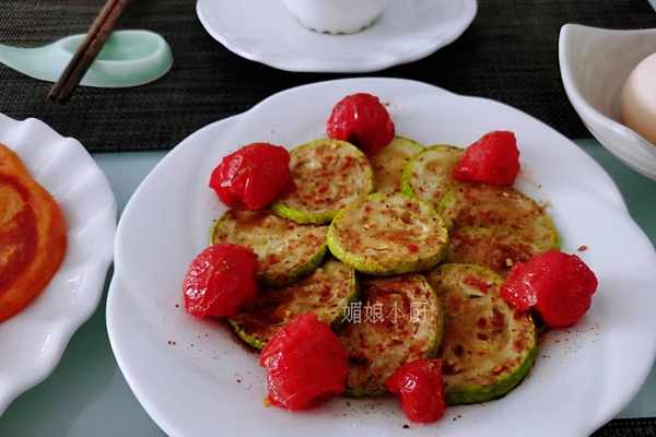 ①、西葫蘆洗凈切半厘米厚的圓片,煎鍋加油燒熱後放入西葫蘆片,中火煎至起黃色,翻面再煎至黃色,夾出裝盤