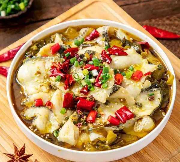 第五步:湯底加酸菜、鹽、雞精、花椒粉、白醋、先燙豆芽跟油麥菜,放盤底,放剛才醃制好的魚片,小火,30秒!倒入湯底,這個湯底真的好香呀!