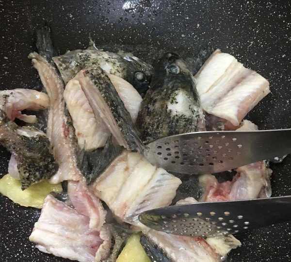 第二步:煎魚骨頭,煎到兩面黃金色,快點撈出來!