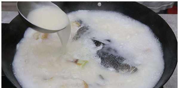 第三步:煮湯底。油熱下生薑,大蒜爆香香,倒剁椒碎,炒香,酸菜下去煸香,倒水煮開,酸菜撈出,這可是湯底香的訣竅!接著趕緊倒煎好的魚骨下去!把火開到最大,把魚骨裡面的營養逼出來。