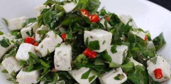 香春芽切碎與豆腐塊兒放在一個盆中,放小米椒,芝麻油 ,少量的食鹽,雞精,攪拌均勻即可食用 。