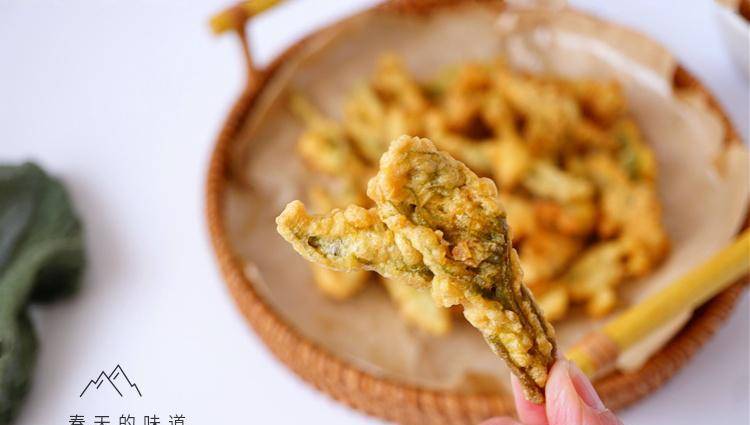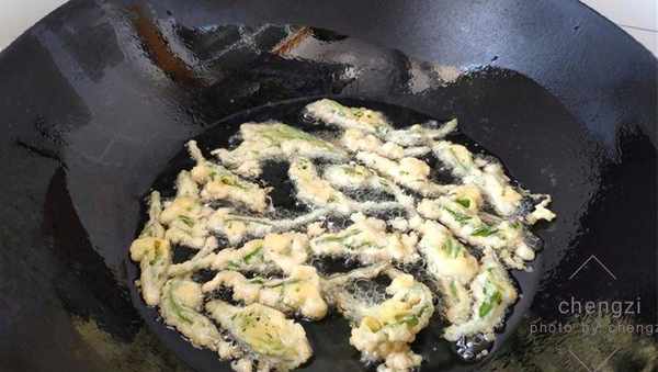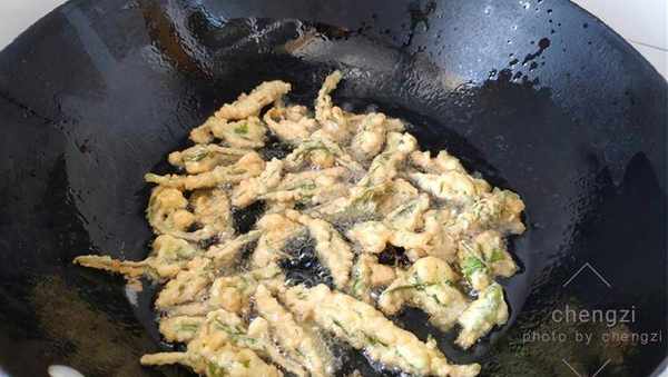 5、鍋內加略多些的植物油,燒至六成熱,就是用筷子試探,周圍有一些小氣泡產生,這時候用筷子將沾瞭面糊的香椿一個個夾入鍋中開始炸制,炸至表面發焦控油撈出。