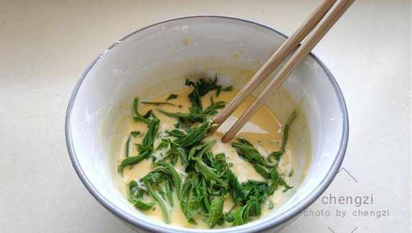 4、把香椿攥幹水分,放入調制好的面糊中攪拌均勻,讓每一顆香椿都沾上面糊。