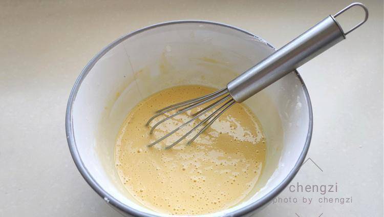 3、1個雞蛋打入碗中先攪拌均勻,加入適量面粉和淀粉,這兩者的比例為1:1,再加點無鋁泡打粉、適量清水攪打均勻,呈和酸奶粘稠度差不多的面糊糊。