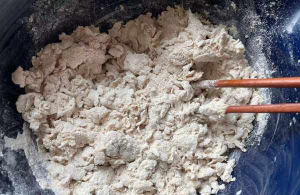 4,和面盆中放入全麥面粉,再將酵母水慢慢倒入面粉中,邊倒邊用筷子攪拌至面絮狀,如上圖所示。