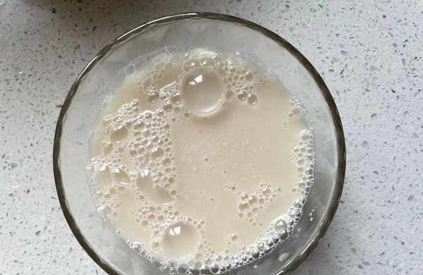 3,碗中加入溫水,水溫不要超過30度,放入幹酵母攪拌均勻,直至幹酵母全部融化,如上圖所示。