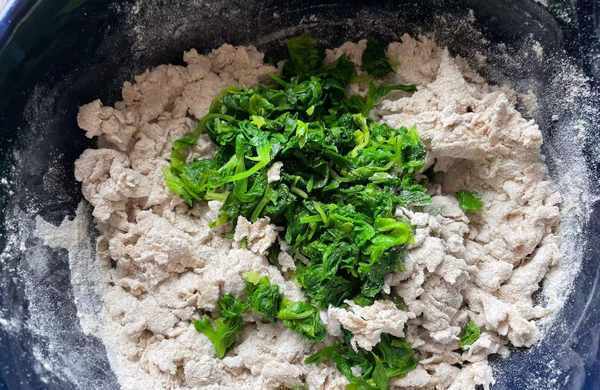 5,然後把芹菜葉子撈出擠幹水分,再簡單切幾刀後放入全麥面粉中,攪拌均勻,喜歡吃帶有咸味的菜饅頭,可以在這一步加入少許鹽增加底味,不喜歡就不放,如上圖所示。