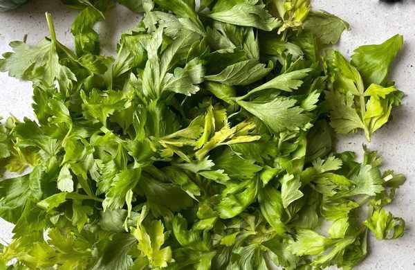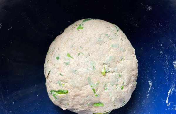 所需食材:全面面粉 350克、溫水 185克、幹酵母 3.5克、芹菜葉 1把、鹽 適量