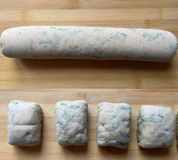 7,時間到瞭,把面團從和面盆中取出,在案板上充分揉均勻,再搓成長條,用刀切成合適的大小,兩頭邊緣處不太規則,可以切下後揉成一個小面團,如上圖所示。