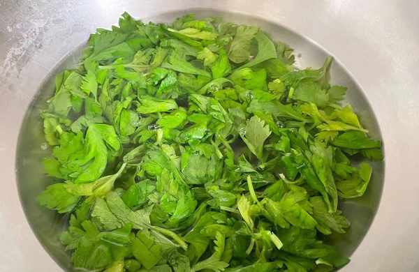 1,吃芹菜的時候摘下來的芹菜葉子,去掉發黃的老葉子後收集起來清洗幹凈,再放入清水中浸泡15分鐘左右,如上圖所示。
