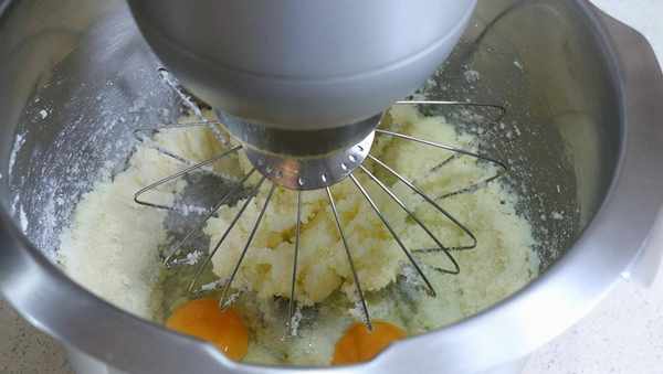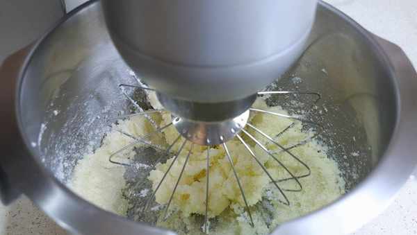 用手持攪拌機以中高速攪打至顏色變白且蓬松,約需2-3分鐘。