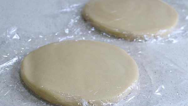 將面團分成兩半,各整形為圓盤狀,單獨用保鮮膜包好後,放冷藏至少30分鐘,最多2天。