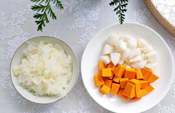 食材準備:鮮銀耳半朵,梨1個,南瓜半圈,冰糖25克