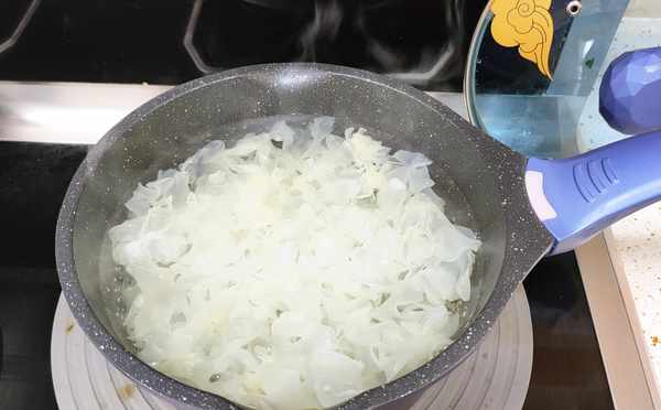 二、燉鍋或是奶鍋加入銀耳3~4倍的清水,大火燒開,放入銀耳煮開,轉中小火10分鐘,再轉小火熬煮10~15分鐘左右。