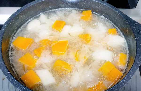 三、燉煮20分鐘左右的時候,銀耳膠質明顯,湯也黏稠,糯糯的時候,放入準備好的雪梨塊和南瓜,再燉煮15分鐘,南瓜熟瞭即可。