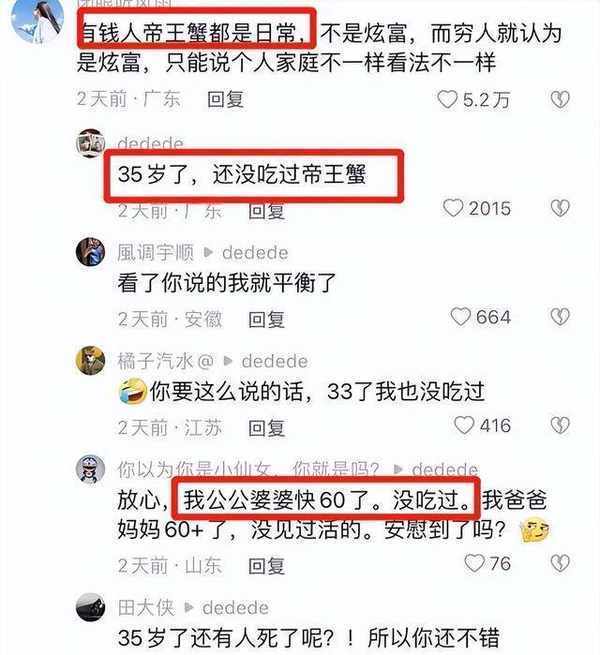 這一句話就紮心瞭,說明他們平時的生活都挺好的,對於網友來說,無異於打臉。很多網友表示:是一輩子都吃不起的東西,這樣的說法就太過於寒酸瞭。當然他們也隻是為瞭評論別人,可能就是檸檬精。