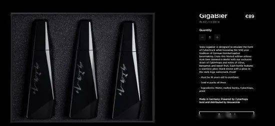 特斯拉在其官網上介紹說:“特斯拉GigaBier既保留瞭Cybertruck的外形設計,又采用德國500年的純釀造法。這款限量版的淡色啤酒在柏林釀造,采用瞭我們獨傢培育的賽博啤酒花,帶有柑橘、佛手柑和甜果的香氣。每瓶啤酒都有一個無縫的亮黑色套筒,上面有一個夜光的Giga水印。幹杯!”
