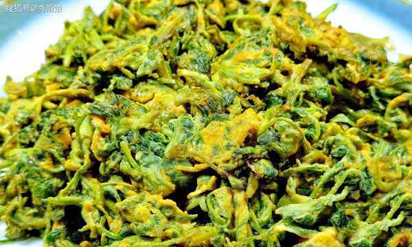 1.艾葉洗凈,焯水後,撈出過涼,擠幹水分,切成小段,裝入盆中,打入2個雞蛋,加入少許鹽,用筷子打散。