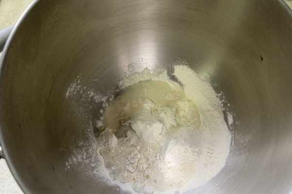 5.將一百二十五克中筋面粉、四十五克豬油、二十五克砂糖和五十克水放入廚師機攪拌桶。