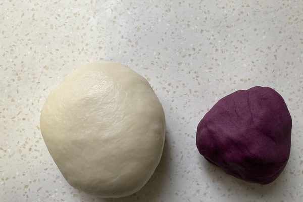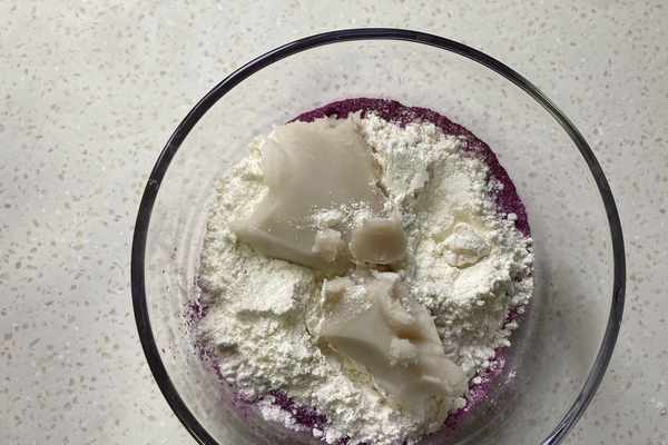 7.八十克低筋面粉、十六克紫薯粉和四十五克豬油攪拌均勻揉成團。
