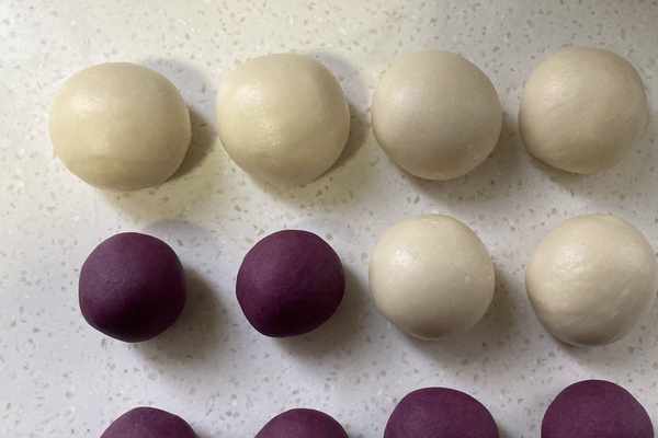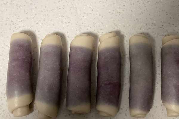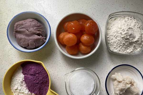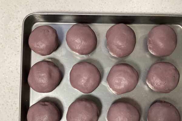 水油皮:中筋面粉125克、豬油45克、砂糖25克、水50克油酥:低筋面粉80克、紫薯粉16克、豬油45克餡料:咸蛋黃12個、芋泥300克做法:
