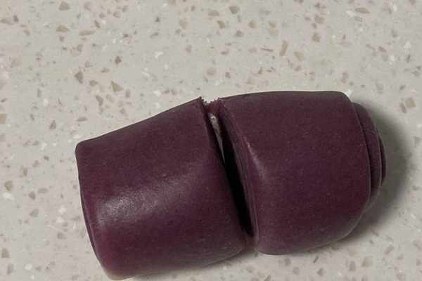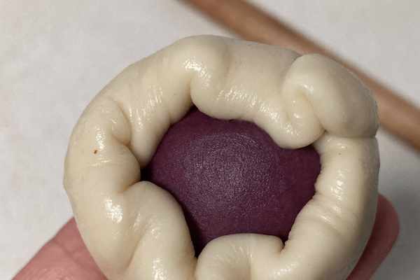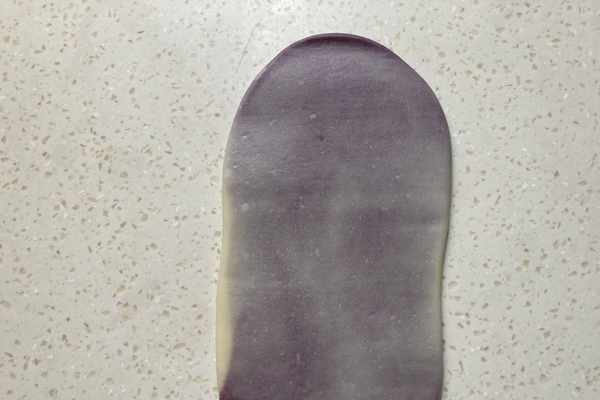14.對半切開壓扁搟開,包入蛋黃芋泥。