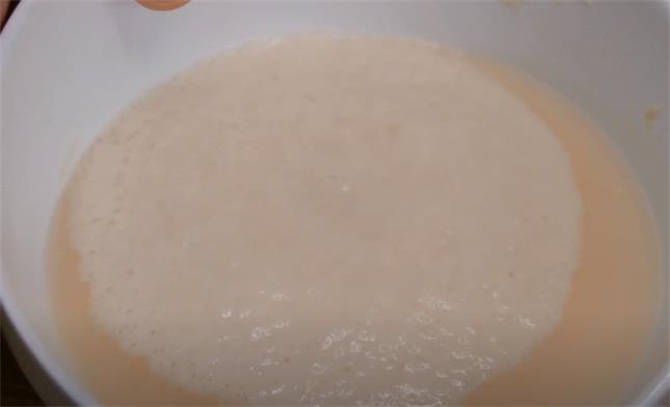 2.時間到瞭,你看表面起瞭好多小沫沫小泡泡,這個時候就是酵母粉活躍的時候,咱們就可以開始和面瞭。