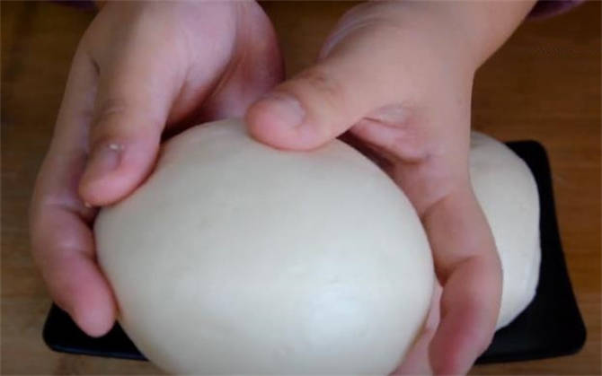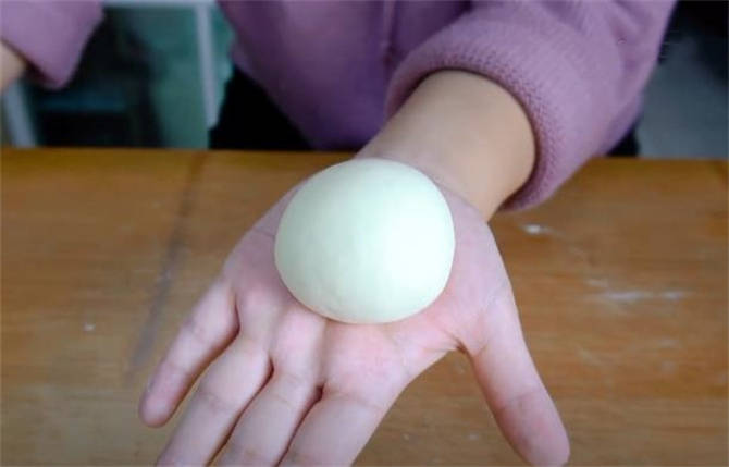 6.把面劑子再充分的給它揉勻,整理成圓形,在掌心稍微的團一下團圓,這個饅頭的生胚就做好瞭。
