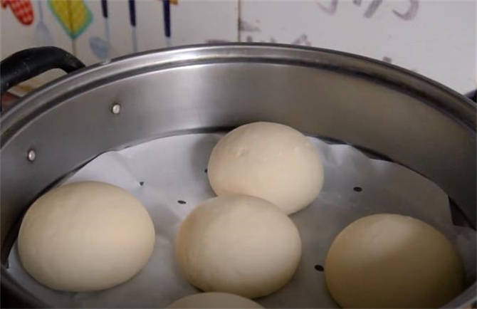 7.提前燒一鍋溫水,把這個生胚放在篦子上,蓋上蓋子餳發到兩倍大,現在已經餳發好瞭,這個手指頭按上去,它可以快速的回彈,大火燒開蒸上15分鐘,燜5分鐘再開鍋,不然這個饃容易塌。