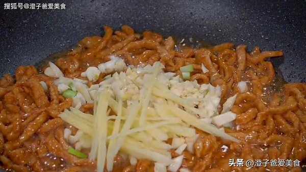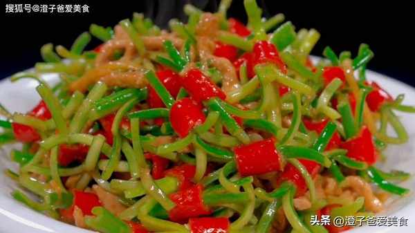 4.鍋中油熱,把醃制好的肉絲倒進鍋中,炒至表面變色,然後加入半勺生抽、醬油,把肉絲給它炒至上色,切好的蒜末、薑絲還有蒜末都給它倒進鍋中,炒出香味兒,調好的生粉水倒進鍋中,炒香以後倒入我們的蒜苔,開大火翻炒一分鐘左右的時間就熟啦。這樣做的蒜炒肉絲真是太漂亮瞭,每一個都像花兒一樣漂亮,肉絲吃起來鮮嫩又可口,一點也不會塞牙。