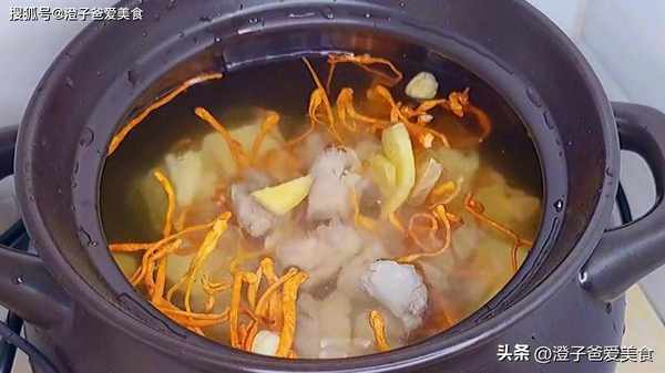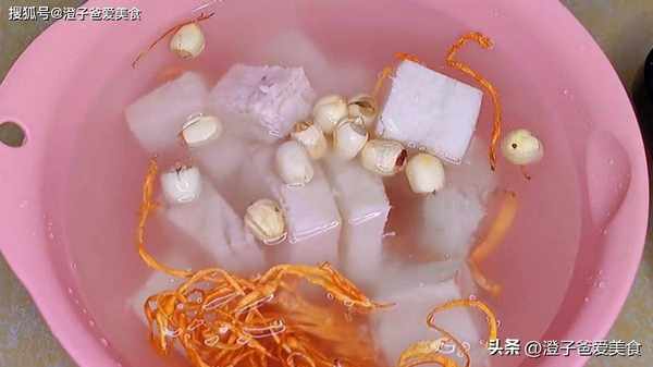 1.今天燉一個葛根燉排骨湯,一塊葛根切成小塊放入砂鍋中,一把蟲草花清洗幹凈,一小把蓮子進行簡單抓勻清洗,清洗好瞭直接倒入砂鍋中,加入適量的水。