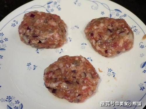 5、都攪拌好後,用手取適當(自己喜歡)的份量,用手調整成有厚度的圓形(漢堡狀)中間用手指壓一個小洞,讓中間的肉變得比較薄,這樣才不會外面都熟瞭中間沒熟。