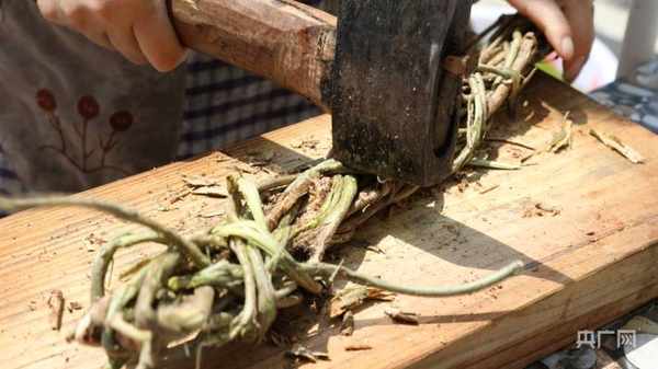 村民正在捶打甜藤(央廣網發 謝達意 攝)