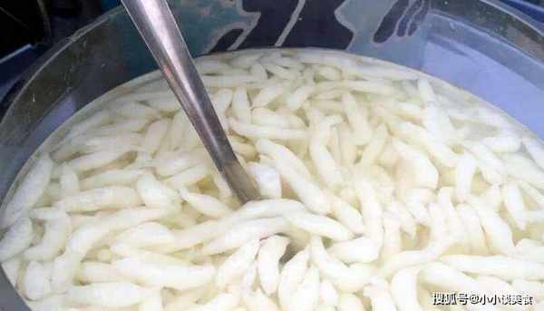 然後準備一個漏勺。如果傢裡沒有濾網,可以用不銹鋼燒餅,但是需要準備一盆冷開水,或者冷純凈水,但是要事先把水涼瞭,不能用自來水,不然吃的時候會拉肚子,然後把煮好的面團舀到漏勺裡,流到水裡的面糊就變成涼蝦瞭。