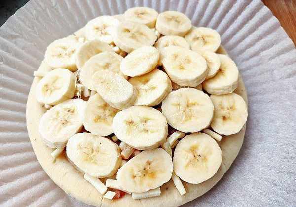 再碼上切好的香蕉片,兩根香蕉的香蕉片全部碼完。