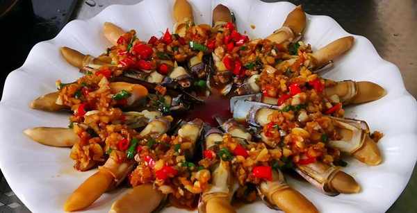 4.取出蟶子去掉外殼,順勢將蟶子肉上的兩道黑邊去掉,然後將蟶子肉擺回到蟶子殼中,上面再澆上調好的蒜汁。提前將鍋中加水燒開,然後放入蟶子蒸8分鐘左右。