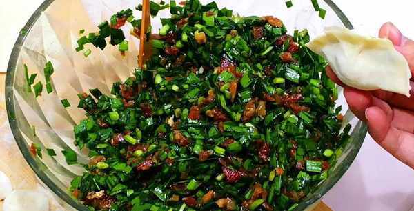 3.韭菜摘洗幹凈後切細放入盆中,然後加入豬肉丁和蟶肉丁,再加入適量的植物油和鹽,攪拌均勻就可以瞭,鮮美極瞭!