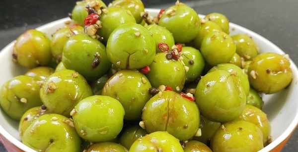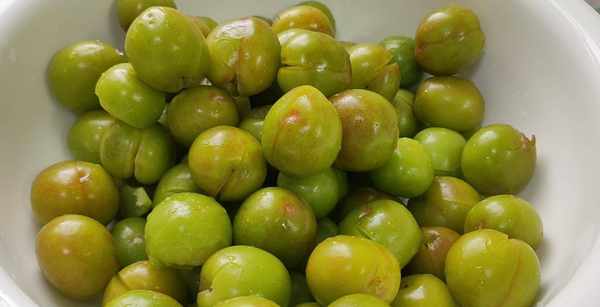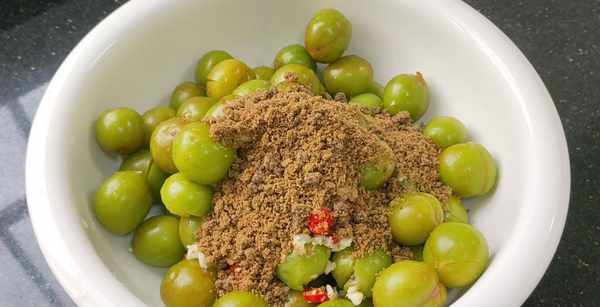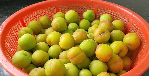 食材準備:青李子3斤,鹽水1大盆,三個小米辣,30克紅糖。