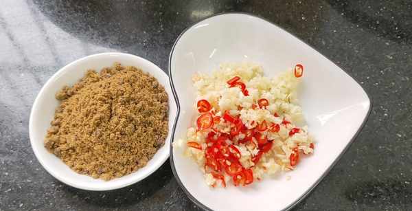 第二步:泡李子的時間,來準備一點配料,準備幾瓣大蒜把它剁碎,剁好後再切三個小米辣,同樣把它切碎,喜歡吃辣一點的可以多加一點,吃著更帶勁,另外再準備30克左右的紅糖,喜歡吃甜一些的可以多加一點。