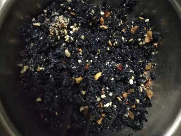 3、接著我們將電飯鍋蓋好,開啟蒸飯的程序,將米飯蒸熟。然後我們可以拌入自己喜歡的食物,芝麻,果仁,葡萄幹等等都可以,接著就可以食用瞭。