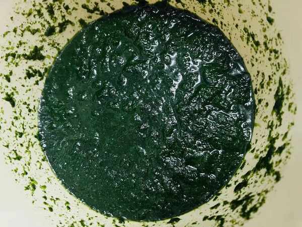 3、將艾葉放到開水中煮軟,接著撈起,水分不要太多,保證料理機能夠轉動起來即可。攪散之後,加入50克左右的白糖,放到艾草汁中化開。